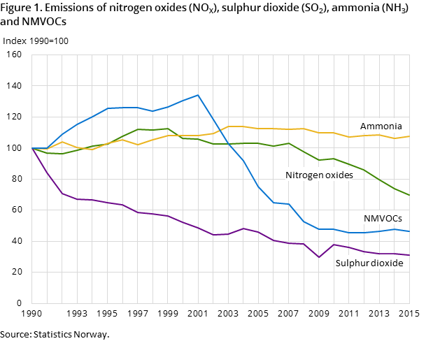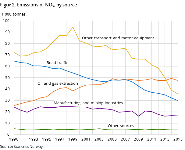 In 2015, 134 100 tonnes of nitrogen oxides (NOx) were emitted in Norway. This means a continuation of the declining emission trend. The emissions were 5.4 per cent lower than in 2014, and well below the obligation in the Gothenburg Protocol of 156 000 tonnes.
