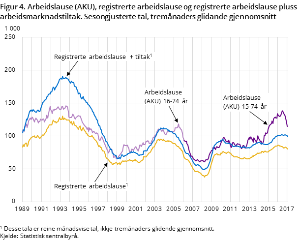 Frå oktober (gjennomsnitt september–november) 2016 til januar (gjennomsnitt av desember–februar) 2017 gjekk den sesongjusterte arbeidsløysa ned med 0,6 prosentpoeng, eller 17 000 personar. Nedgangen kom i hovudsak blant personar over 24 år og var sterkast blant menn. Talet på registrerte arbeidslause og ordinære tiltaksdeltakarar hos NAV gjekk til samanlikning ned med 1 000 personar i den same perioden. Dette talet er også sesongjustert og eit gjennomsnitt av tre månader.