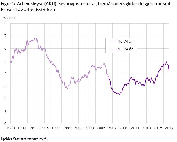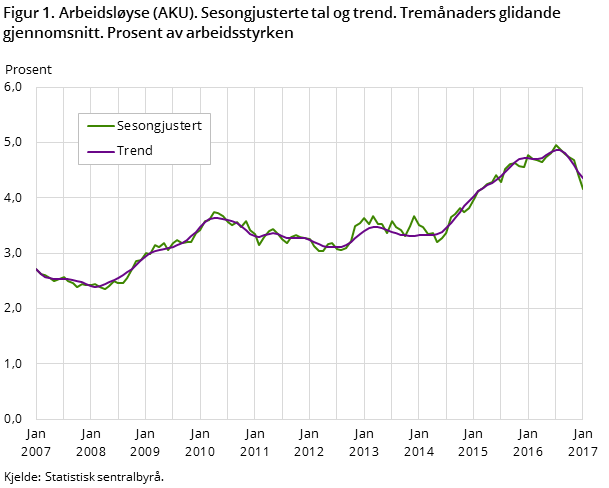 Frå oktober 2016 til januar 2017 gjekk den sesongjusterte arbeidsløysa ned med 0,6 prosentpoeng, til 4,2 prosent. Nedgangen kom i hovudsak blant personar over 24 år.