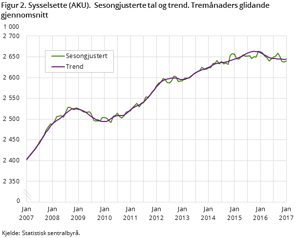 Ifølge Arbeidskraftundersøkinga (AKU) gjekk det sesongjusterte talet på sysselsette ned med 11 000 personar frå oktober 2016 til januar 2017. Denne nedgangen er innanfor feilmarginen i AKU. I denne perioden auka befolkninga i alderen 15-74 år og sysselsettingsprosenten gjekk ned med 0,4 prosentpoeng, til 66,8 prosent i januar.