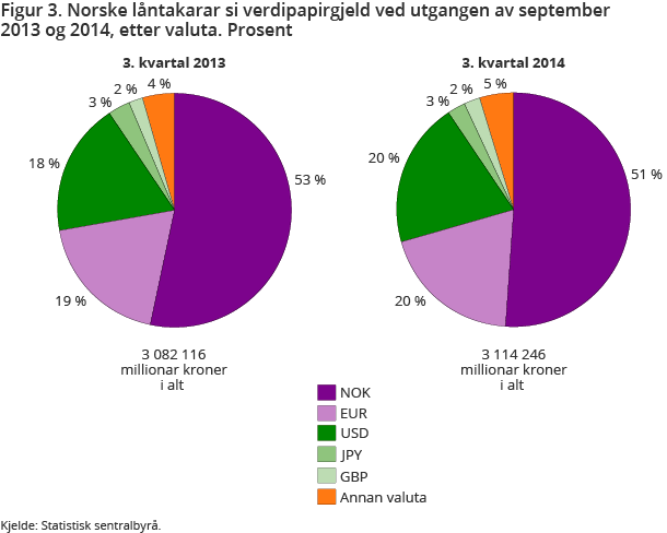 Nesten alle lån i Noreg blir tekne opp i norske kroner, medan låna som innlendingar tar opp i utlandet, blir tekne opp i euro, amerikanske dollar, japanske yen og i nokre tilfelle annan valuta. Frå september 2013 til september 2014 svekka kronekursen seg særleg mot dollar og britiske pund. Dette, saman med ein moderat vekst i volumet for emisjonar utanfor Noreg, førte til at gjelda frå emisjonar av obligasjonar og sertifikat som norske einingar har i Noreg og utlandet, samla gjekk opp med om lag 1 prosent.
