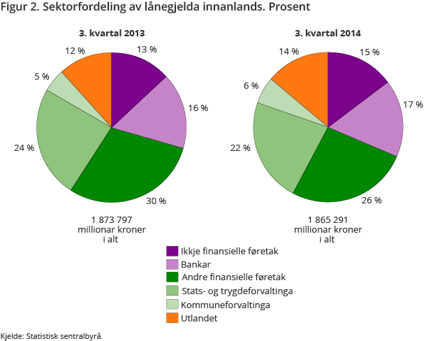 Offentleg forvaltning tek framleis opp betydelege lån i Noreg, men langt mindre enn tidlegare. Samla sto stats- og trygdeforvaltninga samt kommuneforvaltninga for 49 prosent av emisjonsvolumet i Noreg i 3. kvartal 2014, mot 67 prosent i same kvartal året før. Dette kjem av at ordninga med å bytte statskassevekslar mot obligasjonar med førerett, som ga betydelege volum, vart avslutta i juni i år. Finansielle føretak sto for 28 prosent av lånevolumet i Noreg, mot 17 prosent av volumet eitt år tidlegare. Dei ikkje-finansielle føretaka hadde teke opp 16 prosent av lånevolumet i 3. kvartal 2014, mot 12 prosent i 3. kvartal året før.
