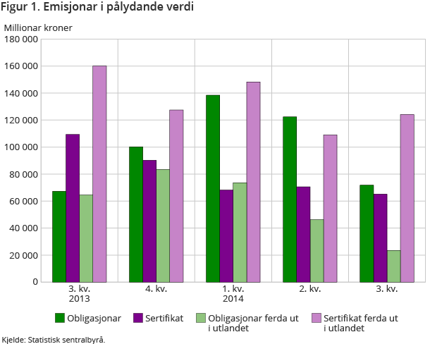 Frå 3. kvartal 2013 til 3. kvartal 2014 gjekk talet på emisjonar i Noreg opp 13 prosent, medan beløpet vart redusert med 22 prosent. I den same perioden vart det registrert 267 emisjonar av obligasjonar og sertifikat som var utførte av norske einingar utanfor Noreg. Den samla verdien på desse emisjonane var 148 milliardar kroner. Talet på, og det samla beløpet for, emisjonane utanfor Noreg var høvesvis 41 prosent og 34 prosent mindre i 3. kvartal 2014 enn i same kvartal året før.