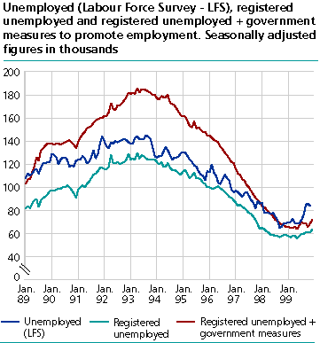 Unemployment rose by 14,000 and employment by 8,000 from fourth quarter 1998 to fourth quarter 1999. There was no change in the average unemployment rate from 1998 to 1999, but the quarterly figures show a 12-month change with declining unemployment until summer 1999 followed by an increase.