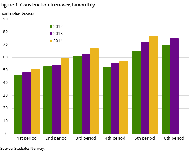 The local kind-of-activity units in the group construction of residential and non-residential buildings had an increase in turnover of 5.9 per cent compared with the 5th period of 2013. This represents an increase of NOK 1.6 billion and a turnover of NOK 29.4 billion. In the same period, turnover among the local kind-of-activity units in the division civil engineering increased by 8.8 per cent, or NOK 812 million, and reached NOK 10.0 billion in 5th period in 2014.