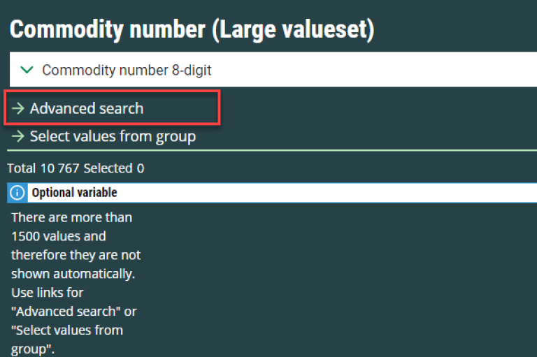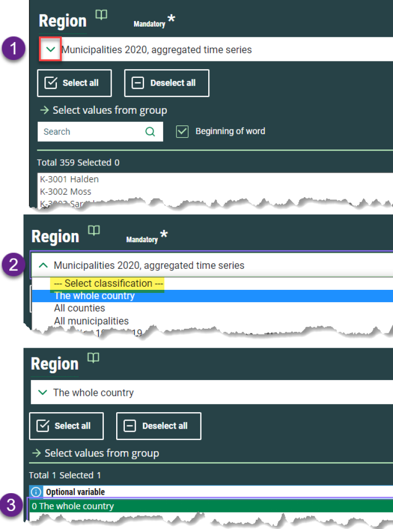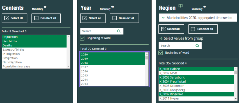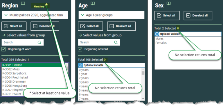 For some variables it is best to have different groupings of values, such as for the variable “Region”. The values here can be grouped as “Municipalities”, “Counties”, “Whole country” or others. These variables always have a pulldown menu from the list box.