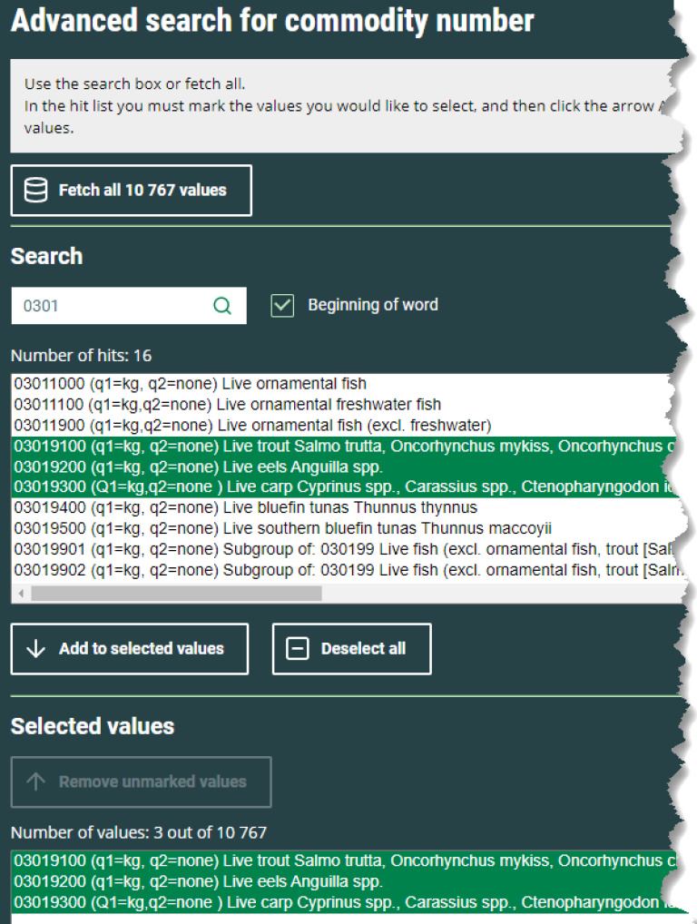 If you have selected one or more values and want to remove these in order to get a total figure, use "Deselect all".