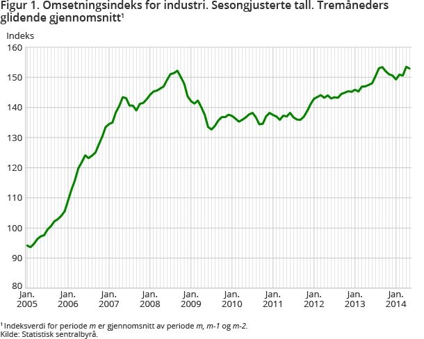 Indeksnivået for industriomsetningen var 152,9 (2005=100) i perioden mars til og med mai 2014, mot 150,9 i tremånedersperioden før, viser sesongjusterte tall .