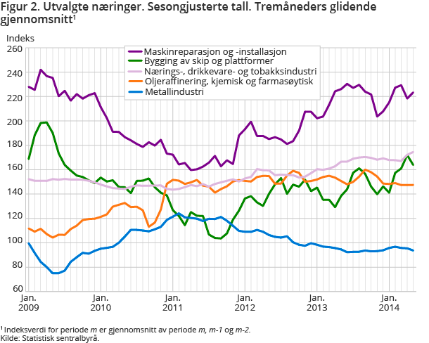 Selv om tremånedersperioden viser en betydelig oppgang for næringsmiddel- og drikkevareindustrien, har det ifølge sesongjusterte månedstall vært en markert nedgang på 4,5 prosent i omsetningen fra april til mai. Nedgangen kommer etter et svært høyt nivå i april 2014. Maskinindustri og metallindustri hadde også dårligere omsetningsutviklingi samme tidsrom. Bygging av skip og oljeplattformer viste en liten nedgang.