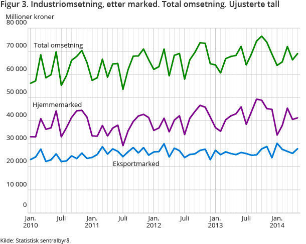 Industriomsetningen gikk opp med 1,3 prosent i perioden mars til og med mai 2014 sammenlignet med foregående tremånedersperiode, viser sesongjusterte tall. Oppgangen på hjemmemarkedet utgjorde 5,5 prosent, mens eksportmarkedet hadde en nedgang på 5,4 prosent.