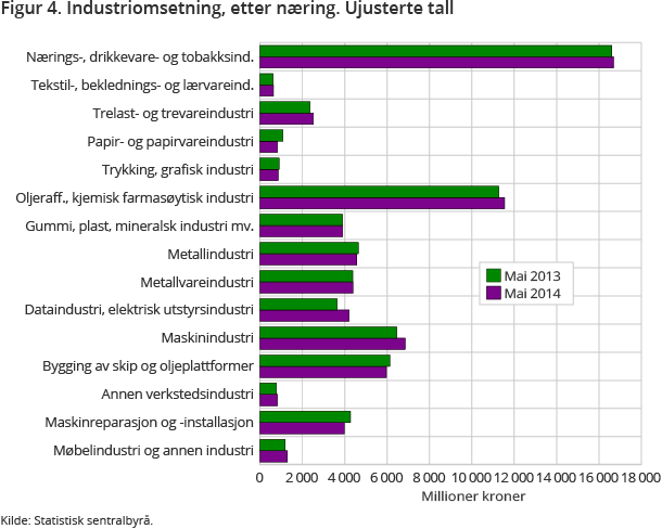 Det største bidraget til omsetningsveksten i industrien i perioden mars til og med mai 2014 sammenlignet med foregående tremånedersperiode kom fra næringsmiddel- og drikkevareindustrien. Denne næringen, som stod for om lag 24 prosent av den totale industriomsetningen, viste en oppgang på 4,0 prosent. En annen viktig bidragsyter var bygging av skip og oljeplattformer. Flere store leveranser av ferdigstilte skip de siste tre månedene har bidratt til en vekst på 4,1 prosent for næringen samlet sett. På tredjeplass følger maskinindustrien som hadde en omsetningsvekst på 3,2 prosent. Produksjonsindeksen viste også en volumvekst for disse næringene i denne tremånedersperioden.