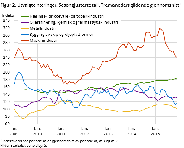 Maskinindustri viste en kraftig nedgang på 18,4 prosent. En vekst på 6,0 prosent i næringsmiddelindustri dempet nedgangen i tolvmånedersperioden.
