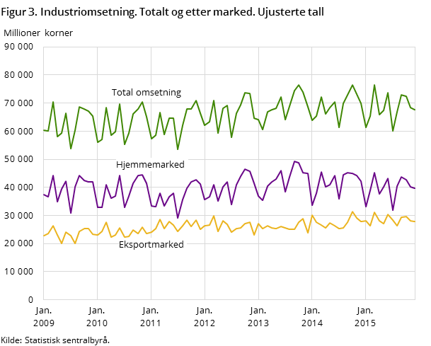 Industriomsetningen gikk opp 3,4 prosent fra november til desember 2015, viser sesongjusterte tall. Det var særlig eksportmarkedet som viste vekst, men hjemmemarkedet hadde også en økning.