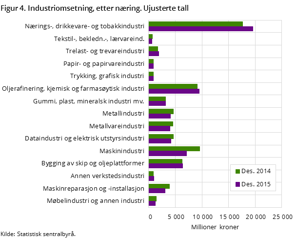 Kalenderjusterte tall viser at industriomsetningen gikk ned med 4,5 prosent fra desember 2014 til desember 2015. Både hjemme- og eksportmarkedet bidro til nedgangen med fall på henholdsvis 6,0 og 2,0 prosent.
