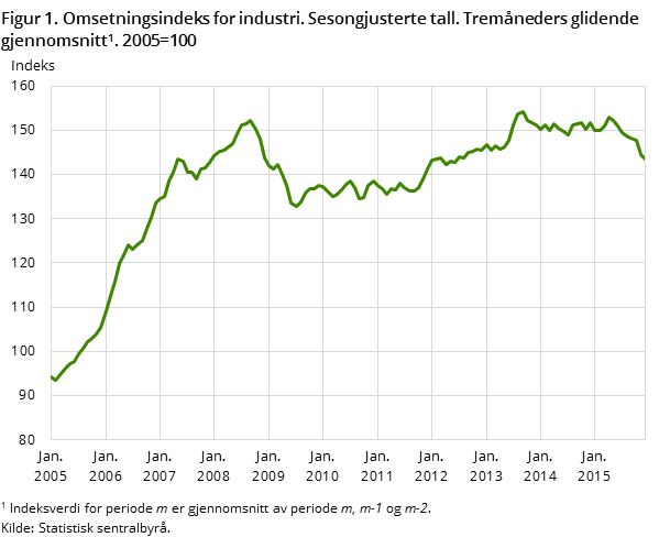 Indeksnivået for industriomsetningen var 143,4 (2005=100) i 4. kvartal 2015, mot 148,1 i kvartalet før, viser sesongjusterte tall.