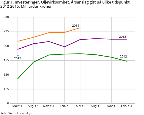 Investeringsanslaget for 2015 oppgis til 182,4 milliarder kroner. Det er 25,8 milliarder kroner lavere enn tilsvarende tall for 2014, gitt i 2. kvartal 2013. Sett bort fra anslaget for nedstengning og fjerning er nedgangen i anslaget fra 2014 til 2015 på hele 33,7 milliarder kroner.