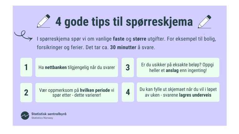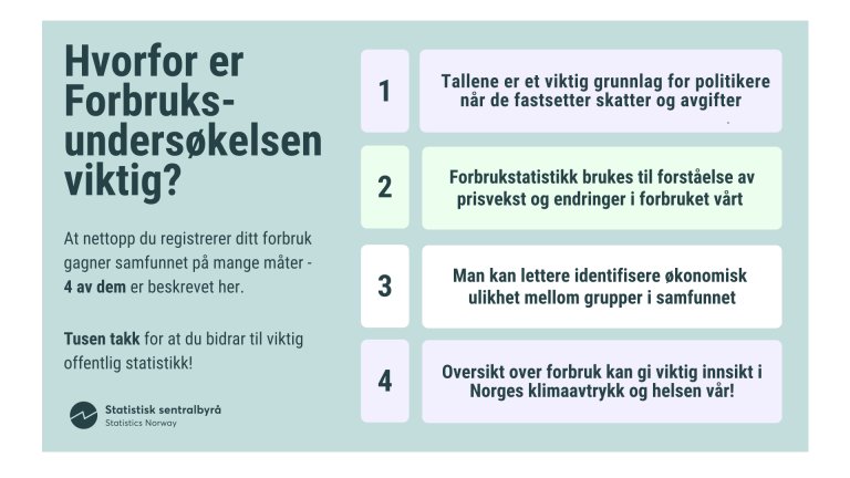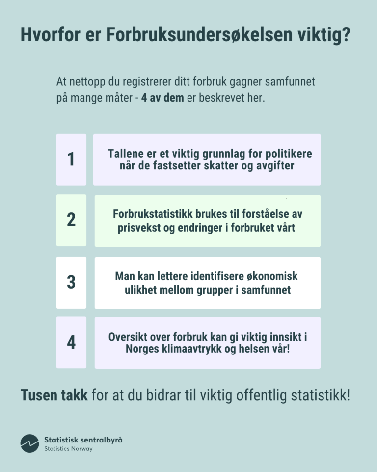 Der frivillig å delta, men dine svar bidrar til bedre resultater. Utvalget er trukket slik at det skal dekke alle typer husholdninger. For at vi skal få gode og pålitelige resultater for alle grupper, er det viktig at så mange som mulig svarer. Hvis for eksempel mange par med små barn ikke svarer, får vi mindre sikre opplysninger om forbruket til denne gruppen.