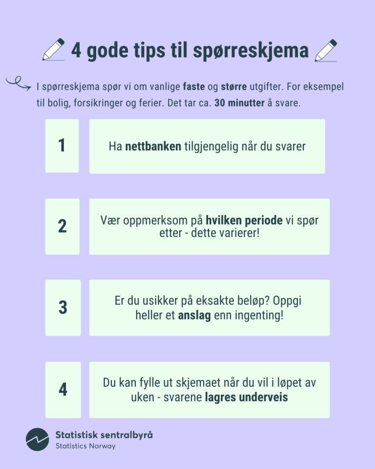 - Svarene dine bruker vi kun til å lage offisiell statistikk og i forskning, og enkeltsvar vil aldri bli offentliggjort.