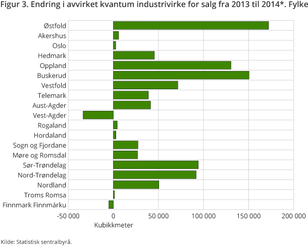 I Nordland økte avvirkningen med 41 prosent fra 2013. I alt ble 176 000 kubikkmeter avvirket her i 2014. Fylkestallene viser også stor økning i Vestfold og Østfold hvor avvirket tømmerkvantum økte med henholdsvis 33 og 32 prosent. Totalt ble det avvirket 292 000 kubikkmeter i Vestfold og 709 000 kubikkmeter i Østfold. Hedmark er det fylket hvor det ble avvirket mest tømmer i 2014. Med en total avvirkning på 2,9 millioner kubikkmeter ble 30 prosent av alt tømmer hogd i Hedmark.
