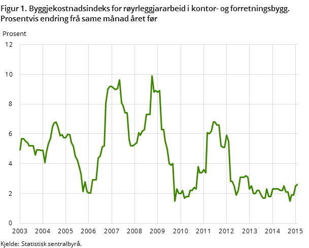 Byggjekostnadene for røyrleggjararbeid i kontor- og forretningsbygg gjekk opp 0,2 prosent frå januar til februar i år. Arbeidskraftkostnaden auka med 0,3 prosent, medan materialkostnadene var uendra i den same perioden.