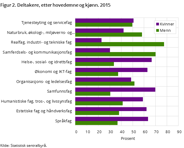Kvinner var i flertall på disse kursene også i 2015, bortsett fra kurs innenfor organisasjons- og ledelsesfag hvor menn utgjorde 52 prosent av alle [deltakerne].