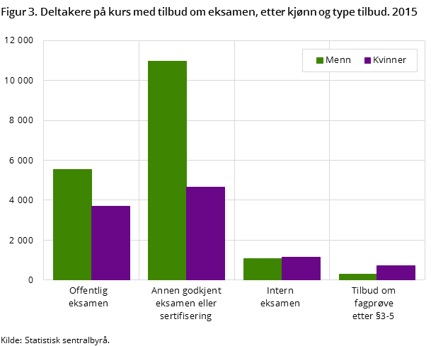 I alt fikk 28 100 kursdeltakere tilbud om avsluttende eksamen eller interne prøver i 2015. Dette utgjorde 6 prosent av samtlige kursdeltakere. Mens 8 prosent av alle menn deltok på kurs med tilbud om avsluttende eksamen eller interne prøver, var denne andelen på 4 prosent blant kvinner. 9 prosent av alle i aldersgruppen 14-29 år, 8 prosent blant 30-49-åringer og 2 prosent av dem i aldersgruppen 50 år eller eldre deltok på kurs med tilbud om avsluttende eksamen eller interne prøver.
