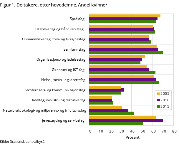 I 2015 fordelte deltakerne seg på de ulike emnene omtrent som tidligere år. Sammenlignet med 2010 økte imidlertid andelen deltakere på kurs innenfor organisasjons- og ledelsesfag samt humanistiske fag, tros- og livssynsfag med henholdsvis 5 og 2 prosentpoeng. I samme periode var det en svak nedgang i andelen deltakere på kurs innenfor de andre emnene.